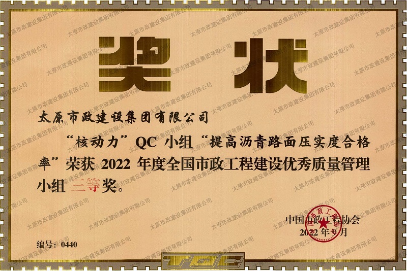 2022年度全國(guó)市政工程建設(shè)優(yōu)秀質(zhì)量管理小組三等獎(jiǎng)_''核動(dòng)力QC小組”提高瀝青路面壓實(shí)度合格率”